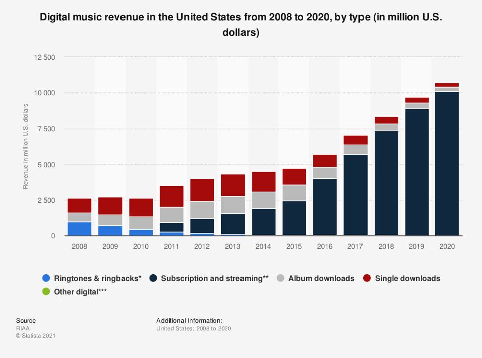 In 2020, revenue from digital album downloads amounted to $319.5 million, which was less than half the figure recorded in 2016. Subscription and streaming revenues have been increasing annually and reached $10.07 billion in 2020, making up the vast majority of revenues for the entire music industry.
